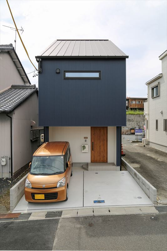 外観はシンプルですが、窓の大きさや配置も考慮してすっきりとしたモダンなデザインとなっています。両面道路なので、北側に玄関とガレージスペース、南面はバイクのスペースとしています。