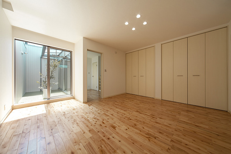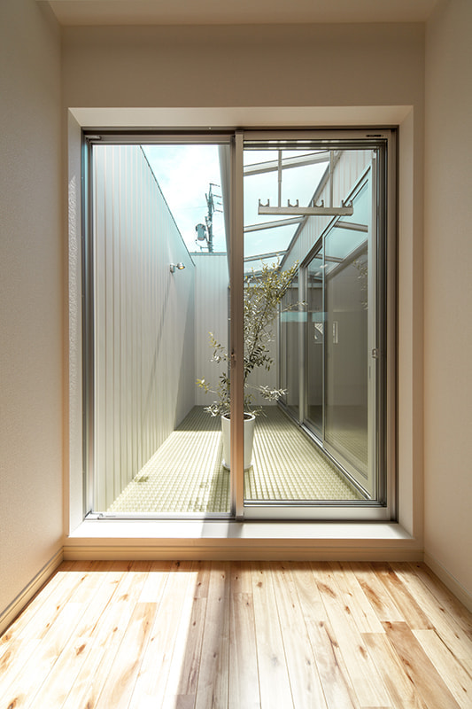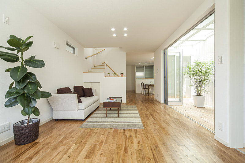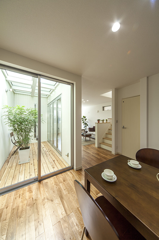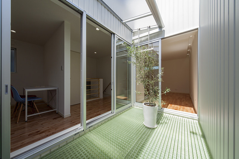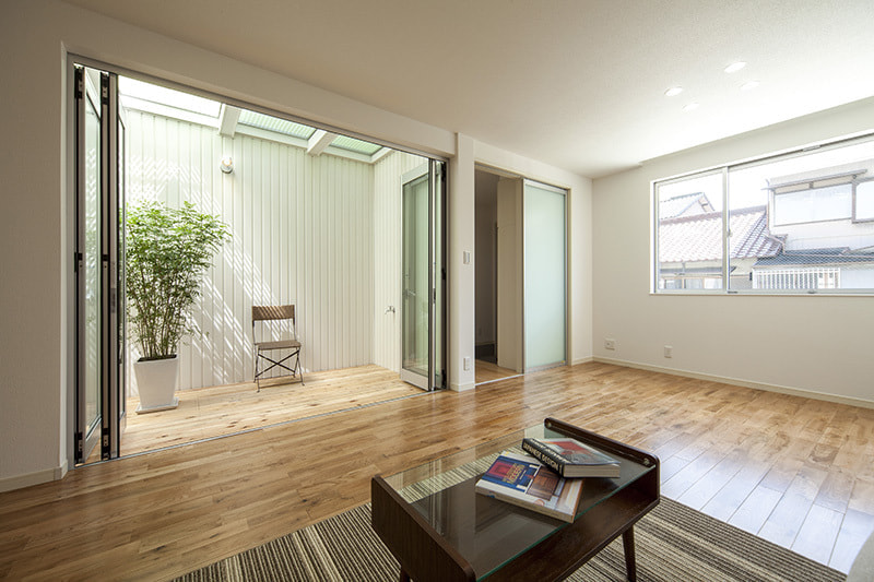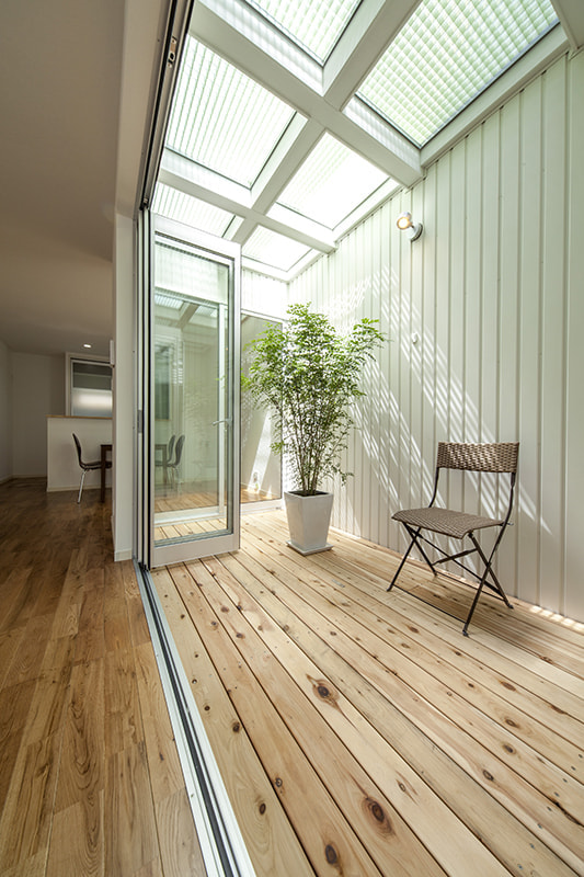 この建物の大きな特徴は、1階のリビングに配置されたウッドデッキの中庭です。リビングとの境にあるフルオープンのサッシを開けると、いきなりリビングと一体化したとても開放的な空間となります。また、天井はFRPのグレーチングなので、優しい光が差し込みとても明るく心地よい暮らしを実現できる空間となるのです。