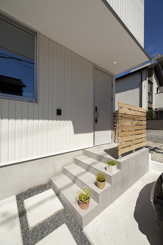 間口が狭い敷地ですが、シンプルでスクエアなデザインの外観は一際存在感のある佇まいです。外壁に採用した白のガルバリウム鋼板もモダンなテイストを醸し出します。