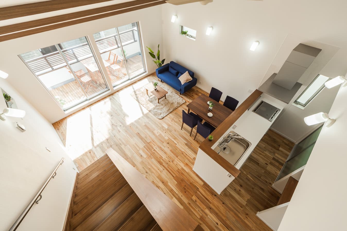 ロフトからリビングを見下ろすと、天井が高いのでとても開放的です。