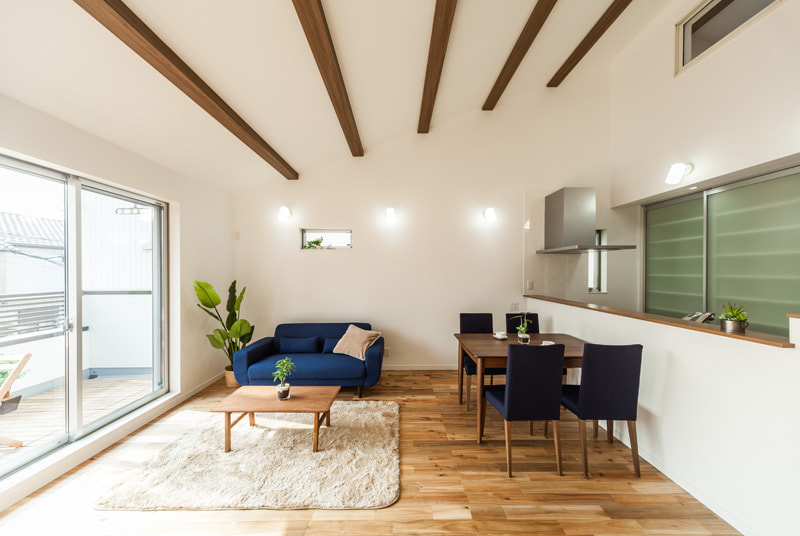 梁型を表した勾配天井リビング。天井が高くて気持ち良い2階リビングです