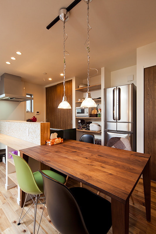 テーブルと高さをそろえたカウンターの使いやすいダイニングキッチン