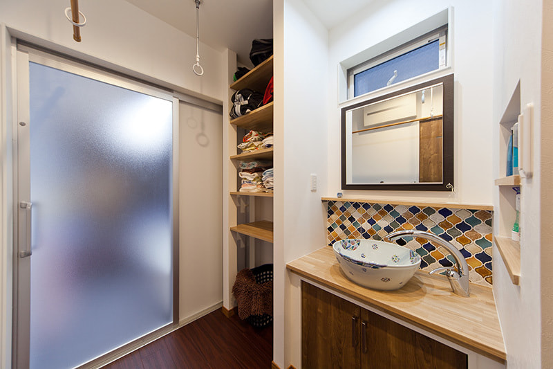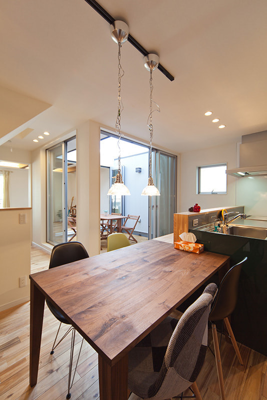 キッチンの正面から中庭を望めるので、子供たちの遊ぶ姿を見ながら料理もできる、子育てにもやさしい間取りです。