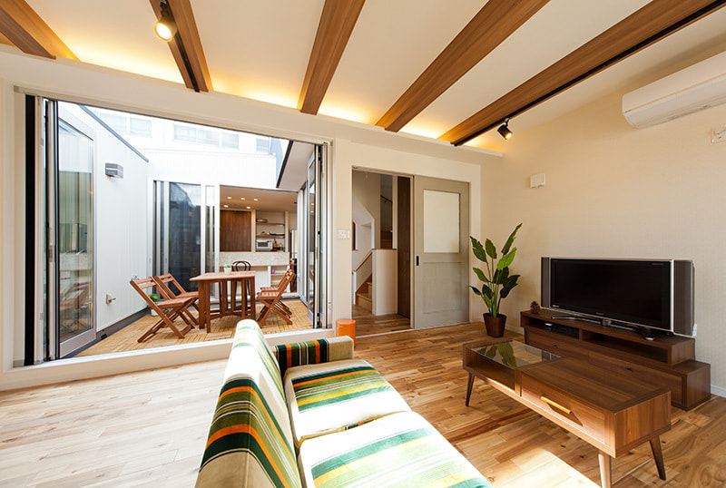 フルオープンできるサッシを赤ればリビングと中庭が一体化します