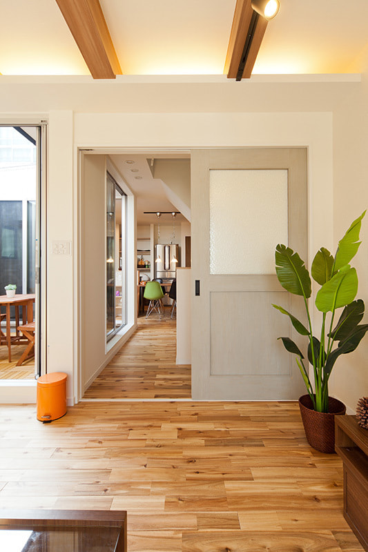 リビングドアは無垢ドア、床も無垢のフローリングででナチュラルテイスト