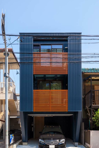 閑静な環境で、間口5m、敷地面積14.8坪という狭小敷地に建つ、屋上ルーフバルコニーとビルトインガレージのある3階建てです。