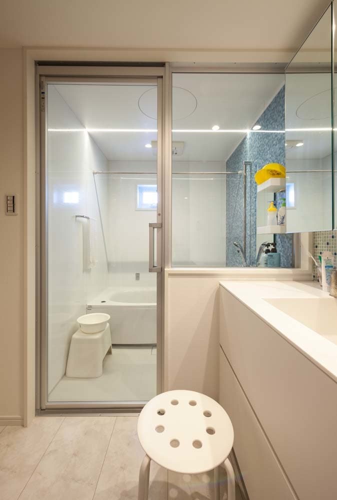 ガラス張りのお風呂。白くシンプルな洗面台とフィットしています。