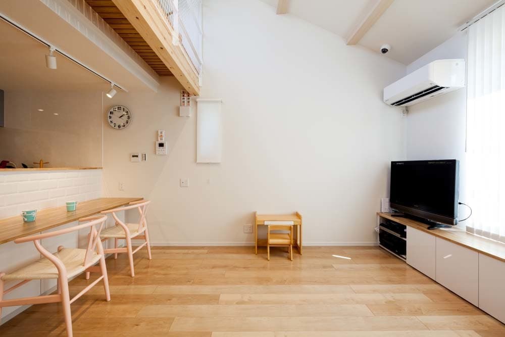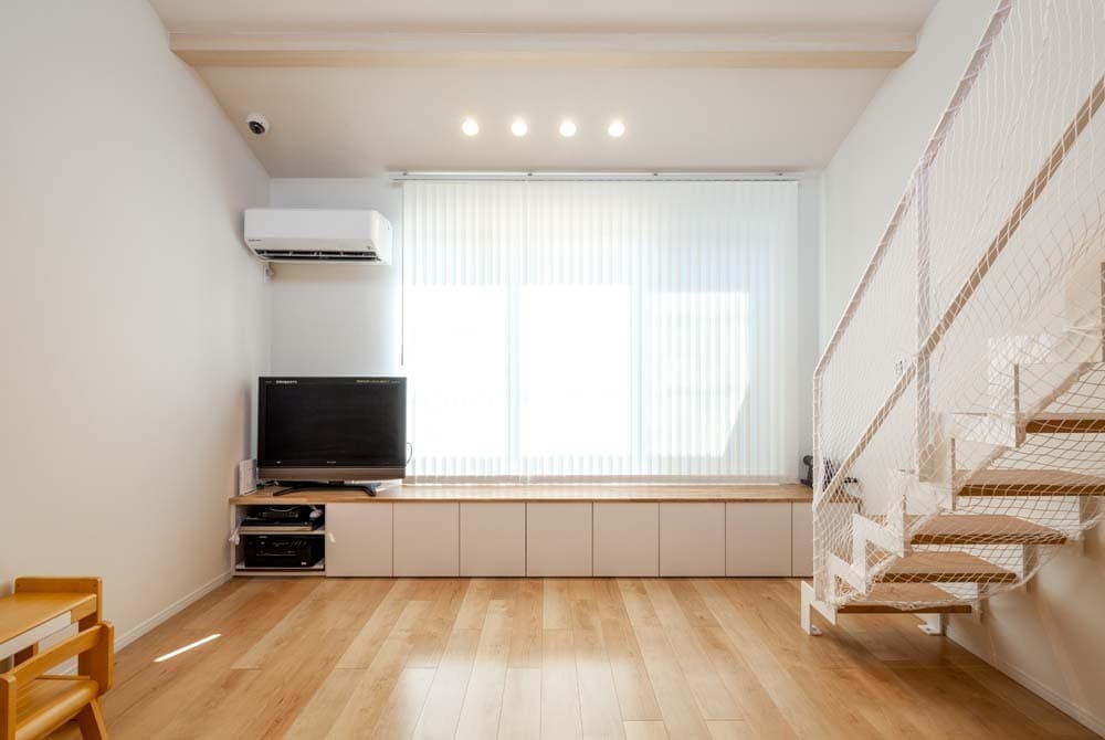 リビングには腰の高さに造作収納をつくり、椅子代わりに腰掛けることも可能です。
