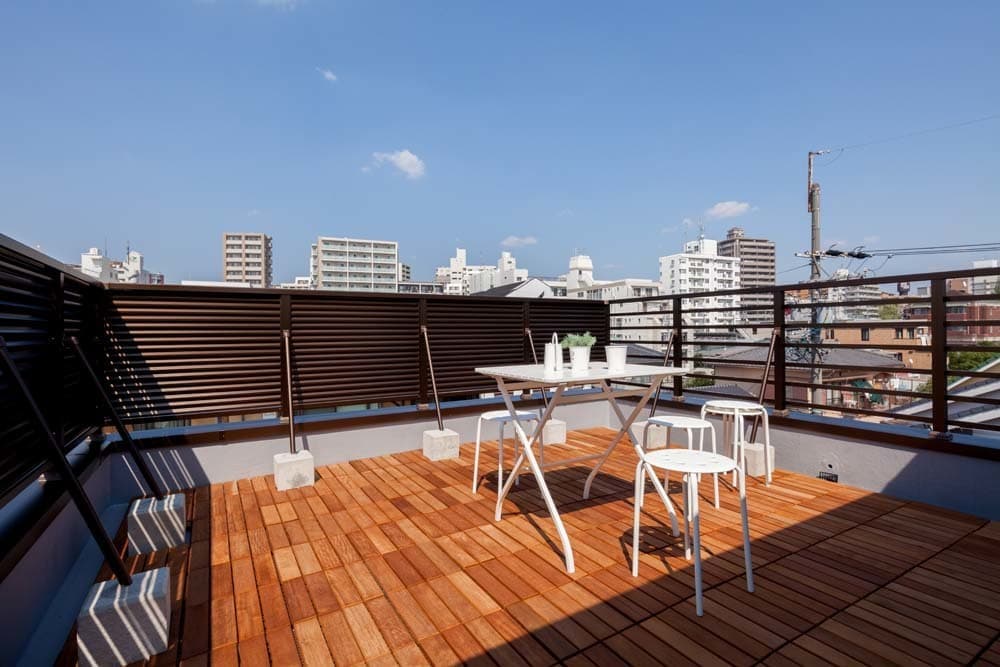 屋上のルーフバルコニー。天気の良い日はテーブルと椅子でくつろげる気持ち良い場所です。