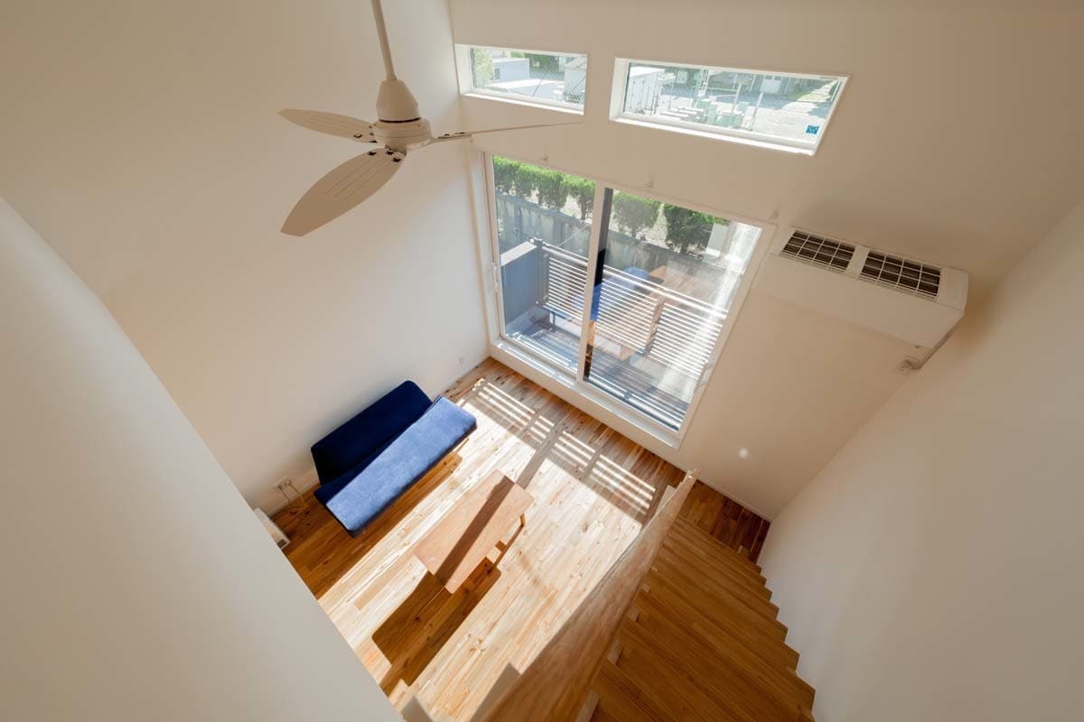 ロフトからリビングを見下ろす。天井が高いのでまるで吹き抜けのような開放感です。