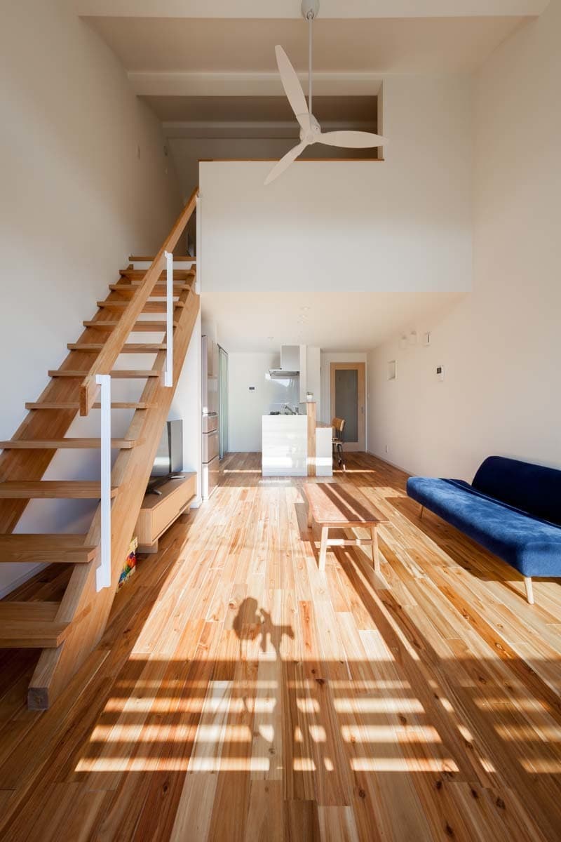2階に配置したリビングは、高い天井高をとることで、とても気持ちの良い空間となっています。シンプルなデザインの木製のスケルトン階段をのぼると、ご主人の趣味の部屋や将来的には子供部屋にもなれるロフト空間もあります。
