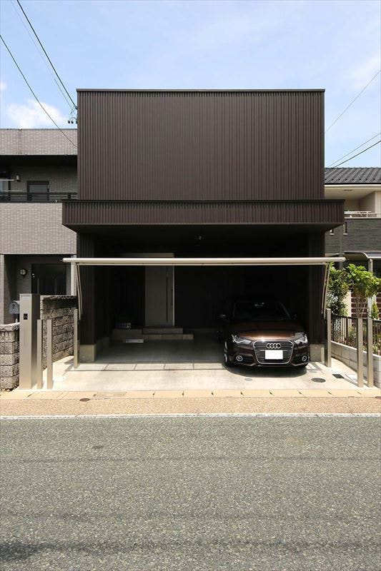 まず、南向きでありながら窓のない外観にとても目を引きます。また、2台分のビルトインガレージがあるガレージハウスでもあります。