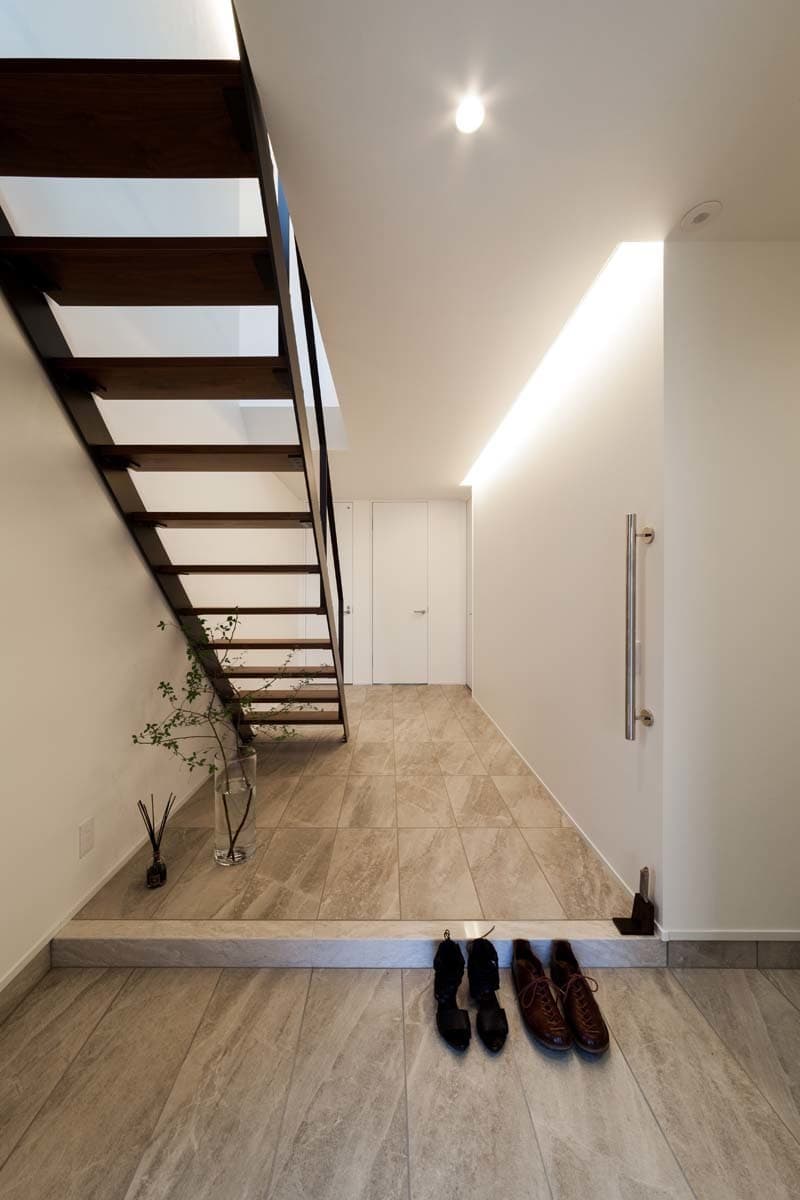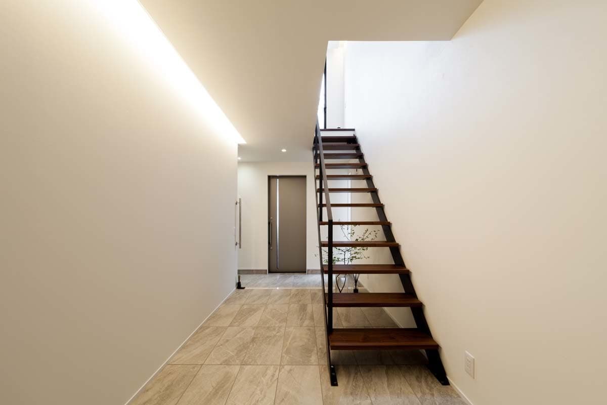 1階ホールは土間と合わせて仕上げたタイルとオープンな鉄骨階段がとても印象的です。