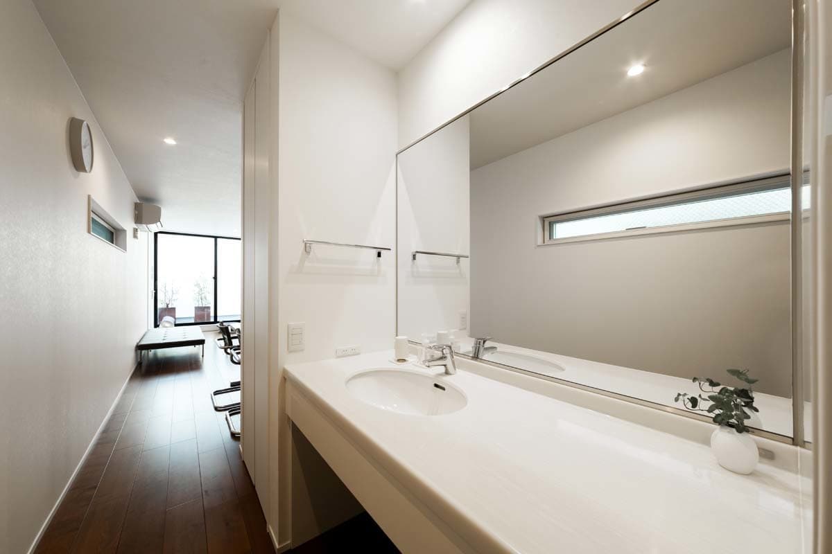 洗面台の配置も空間を無駄なくお風呂の動線に設置。