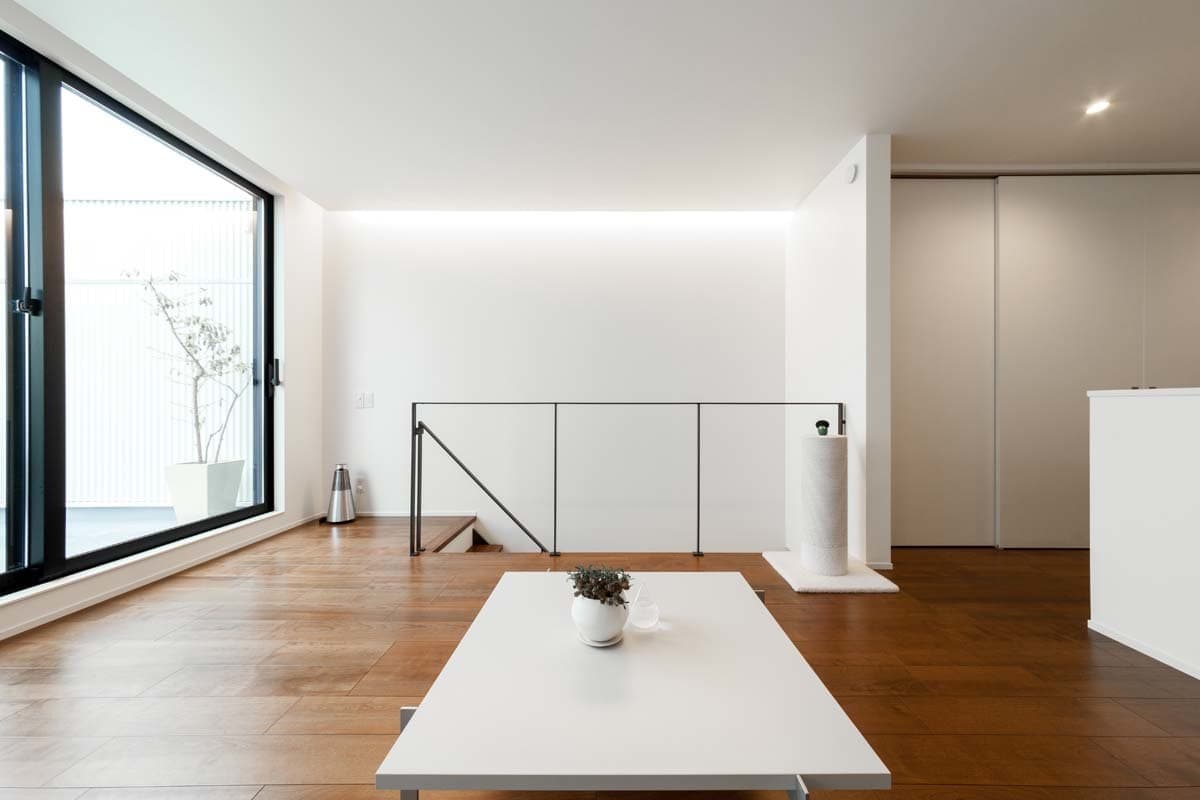 プランニングについては、狭小地でも開放的な空間をコンセプトに、ラウムハウスらしい提案の設計となっています。そして、デザイン関係のお仕事をされているお施主様の意向を反映して、内装のデザインはシンプルながら線のバランスや高さにもこだわりました。その効果もあり、全体的にすっきりと洗練されたテイストの家となっています。
