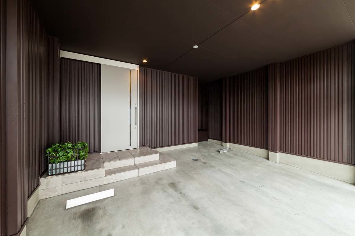 2台分のガレージスペース。植栽のポットやステンレス製の車止めはお施主様自作です。
