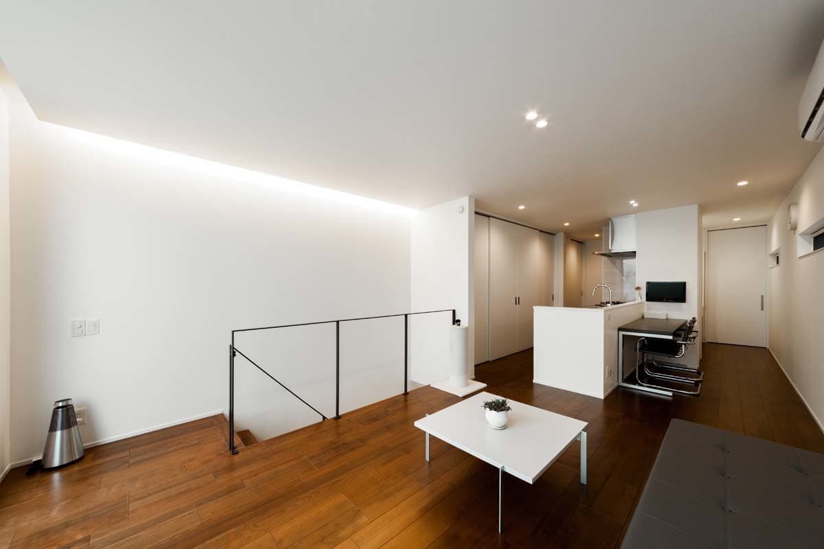 サッシや建具を天井のラインにそろえてあります。間接照明がとても良い雰囲気です。