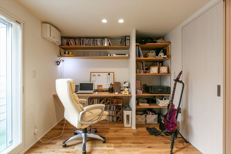 ご主人の書斎兼オーディオルーム。愛用のギターも楽しめる部屋です。