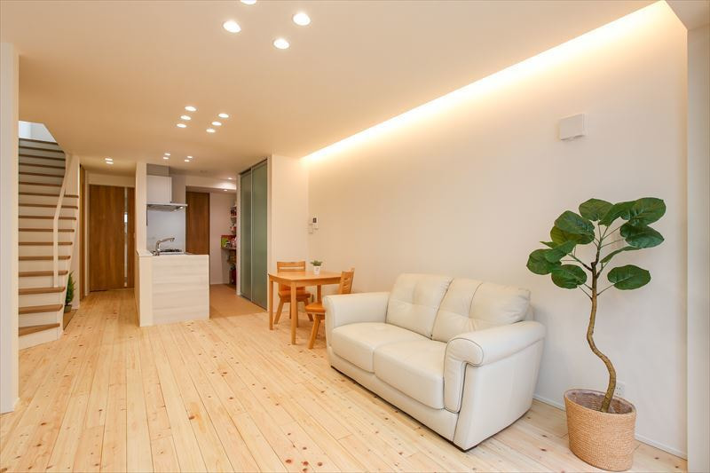 リビングの天井と壁の間に間接照明があり、やわらかい雰囲気を醸しだします。