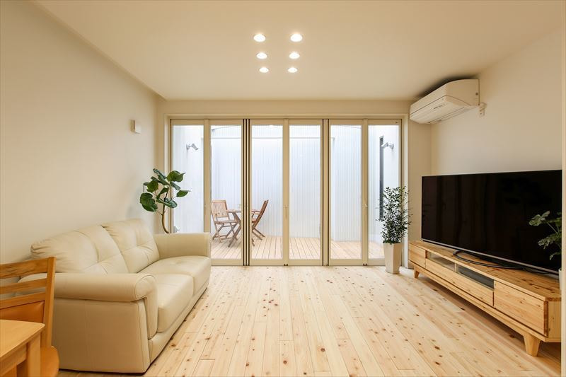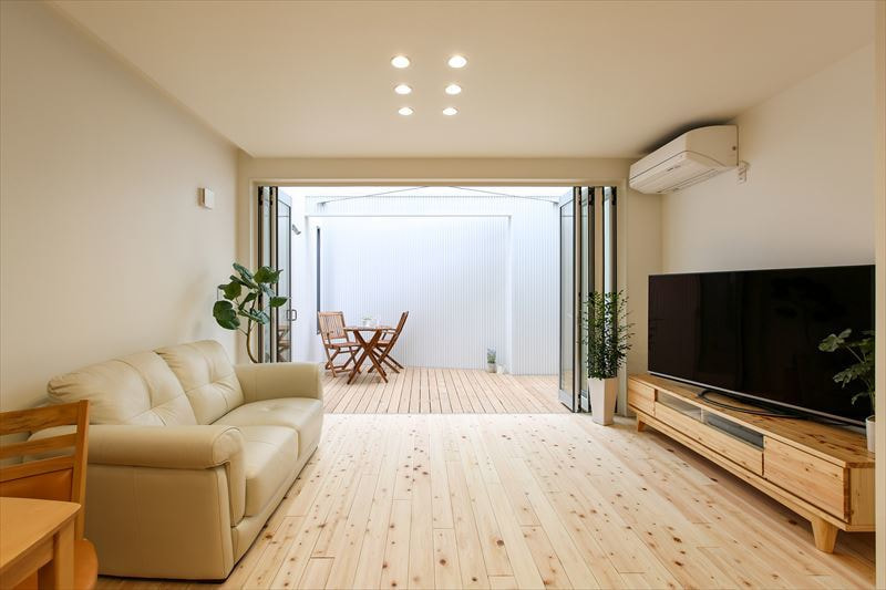 1Fのリビングには全開口サッシがあり、その先はウッドデッキの中庭となっているので、窓を全開にすると、とても広々とした気持ち良いリビングとなっています。