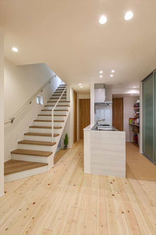 リビングの床は無垢の阿波ヒノキを採用。オープンな階段が空間にアクセントを加えています。