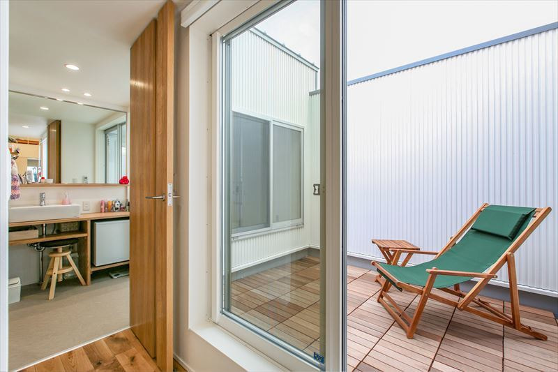 また、2Fのお風呂にはバスコートとしての中庭バルコニーがあり、外からの視線も遮ることでリラックスしたライフスタイルが楽しんでいただける場所となっています。天気の良い夜には、星を眺めながら風呂上がりのビールがご夫婦の楽しみのひとつのようです。