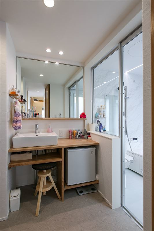 造作で仕上げた洗面台とガラス張りのバスルーム。