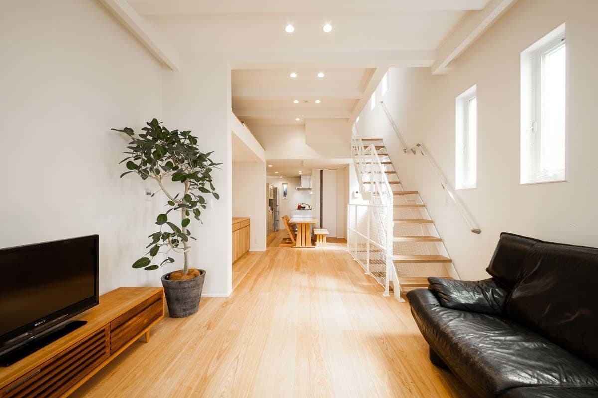 無垢の床と珪藻土のナチュラルなテイスト。スケルトンの鉄骨階段は開放的な空間を演出しています。