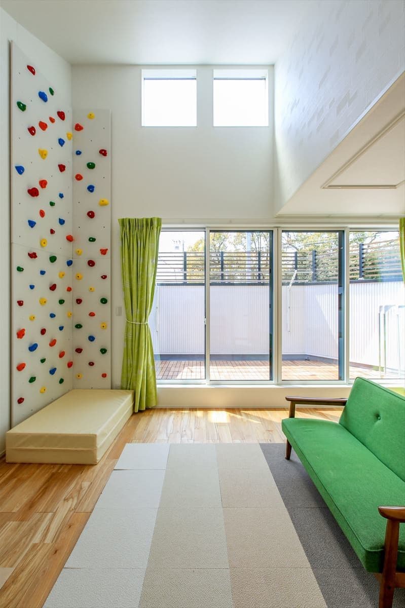 リビングの壁にはボルタリング。高い窓から光が差し込みとても明るい空間。