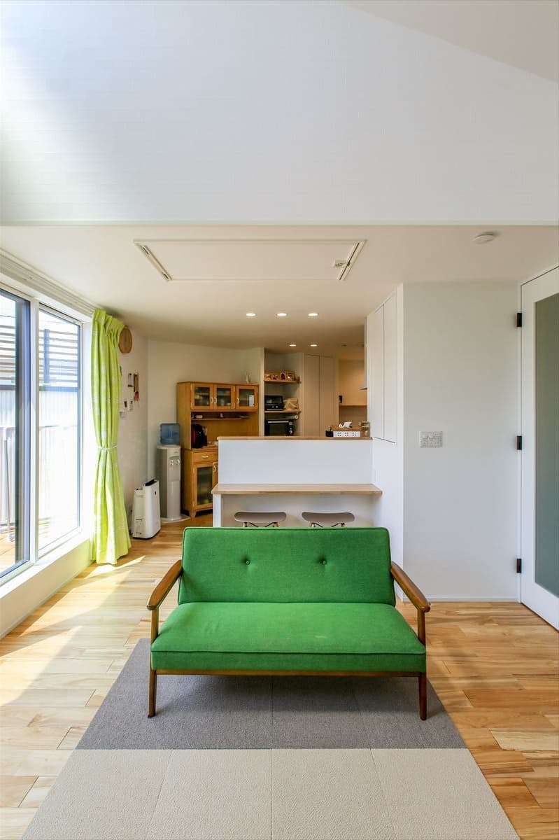 2FのLDKは、リビングスペースとダイニングキッチンスペースをキッチンを中心として分けてあります。リビングの天井は勾配天井でとても開放的です。