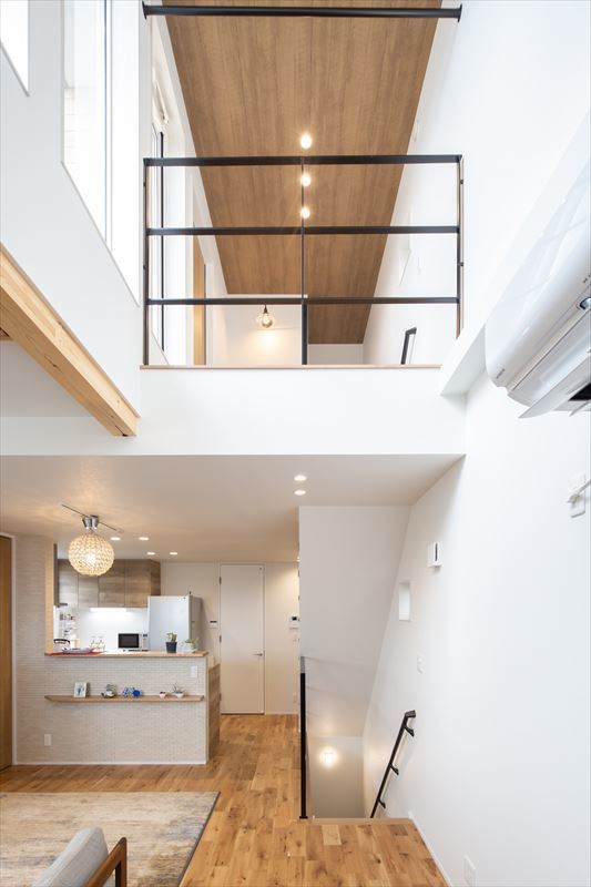 2階のリビングは開放的な吹き抜けになっていて、更にSE構法の構造の梁もあらわしにすることで、ナチュラルなテイストも醸し出しています。