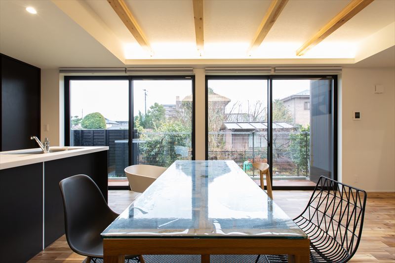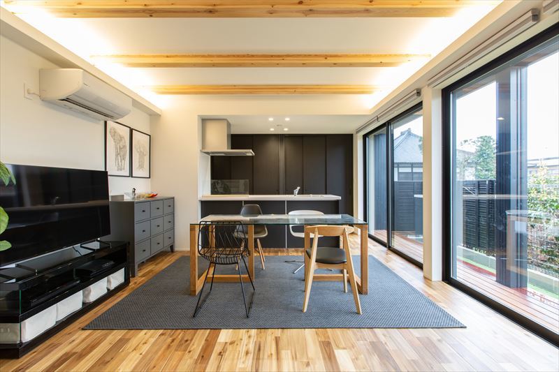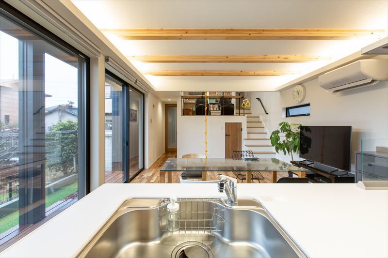 リビングの天井は構造の梁を見せることで天井高を上げ、間接照明も設置することで、ナチュラルで柔らかい雰囲気も醸し出しています。
