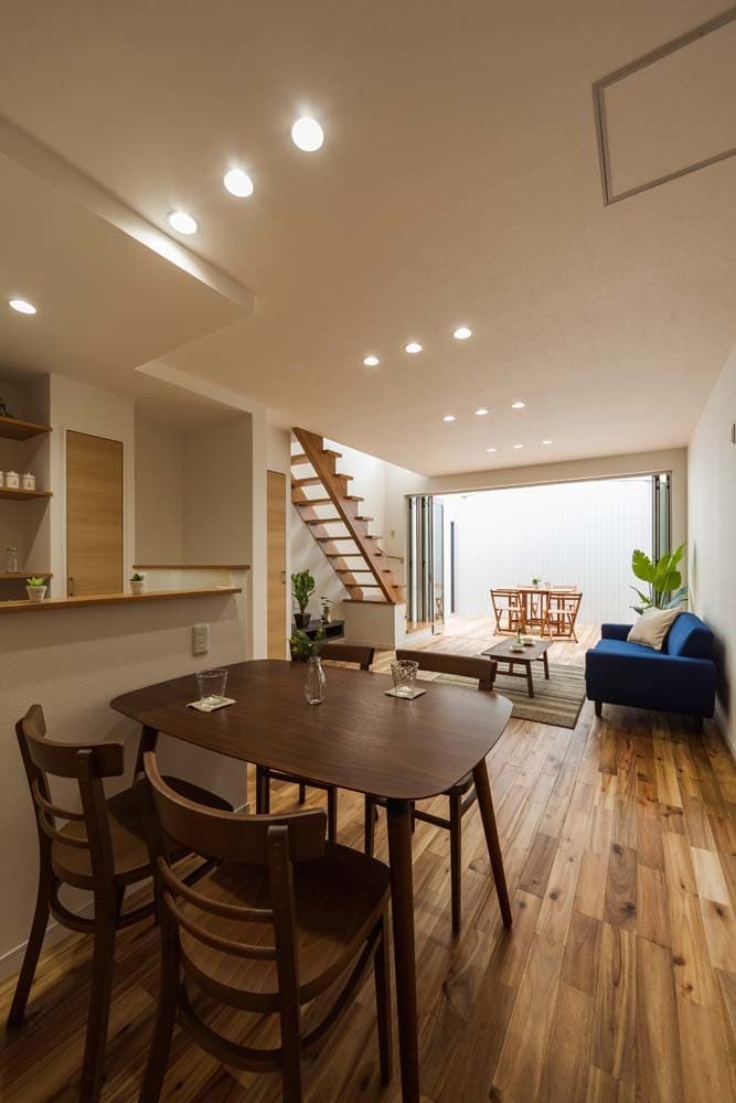 奥行きの長い敷地でも中庭を採用することで奥のダイニングキッチンとリビングがとても明るくなります。