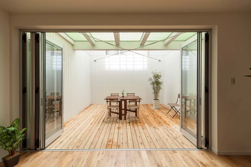 全開口サッシを採用することで、リビングにつながる中庭のウッドデッキも一体感を感じます。