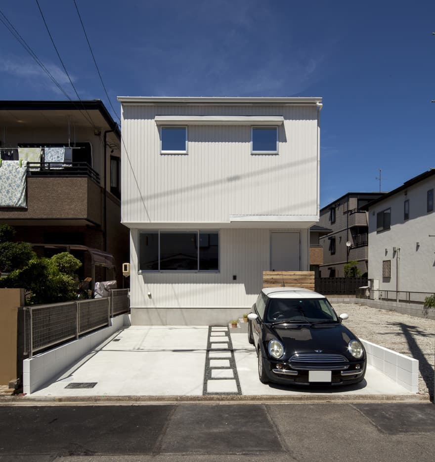 間口が狭い敷地ですが、シンプルでスクエアなデザインの外観は一際存在感のある佇まいです。外壁に採用した白のガルバリウム鋼板もモダンなテイストを醸し出します。