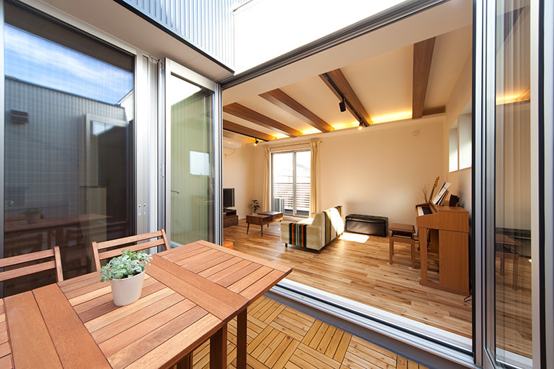 フルオープンできるサッシを赤ればリビングと中庭が一体化します
