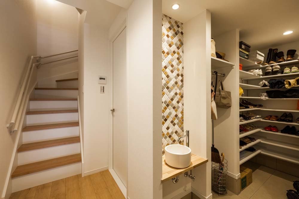玄関にある洗面台ボウルとタイルはお施主様セレクトです。