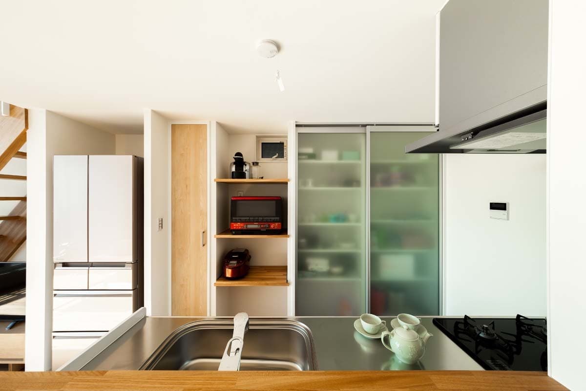 キッチンの後ろには収納力も高いラウムハウスオリジナルデザイン食器棚を設置しました。