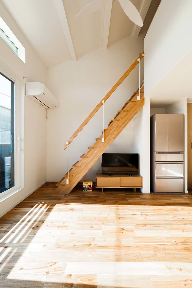 2階に配置したリビングは、高い天井高をとることで、とても気持ちの良い空間となっています。シンプルなデザインの木製のスケルトン階段をのぼると、ご主人の趣味の部屋や将来的には子供部屋にもなれるロフト空間もあります。