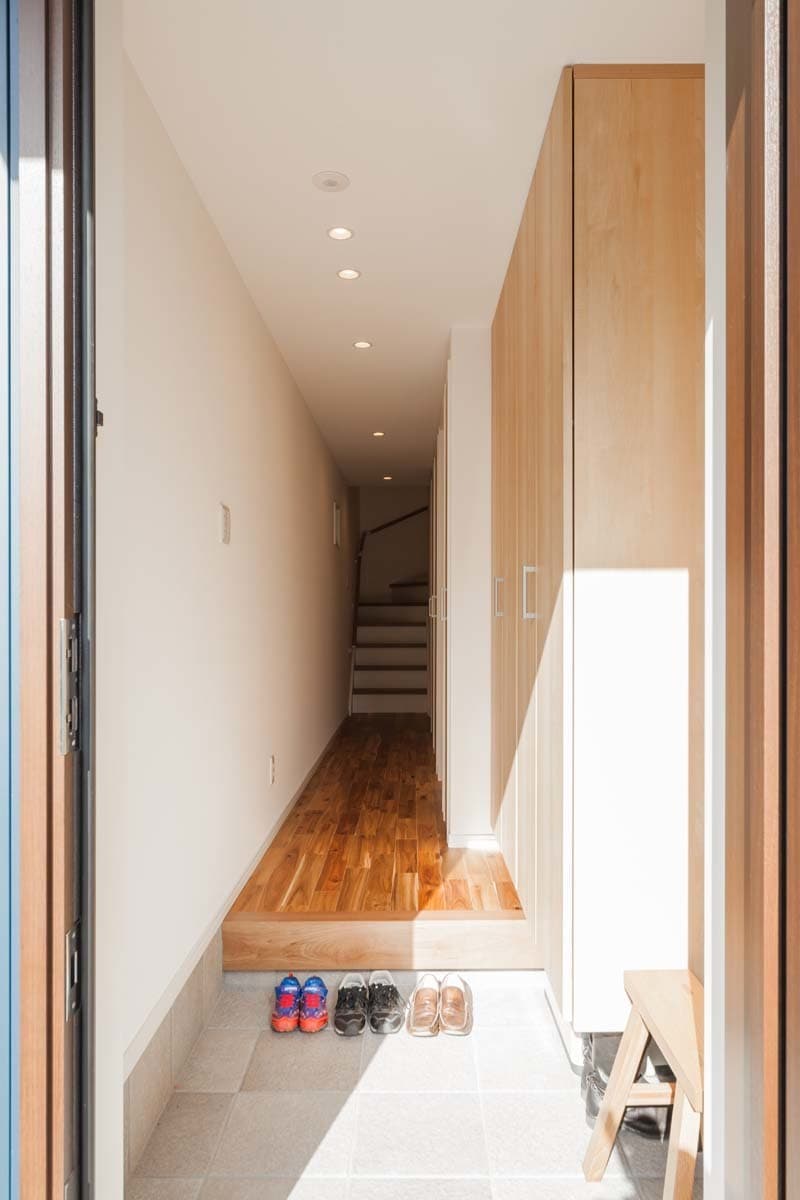 玄関から階段までの廊下にも収納が並んでいます。
