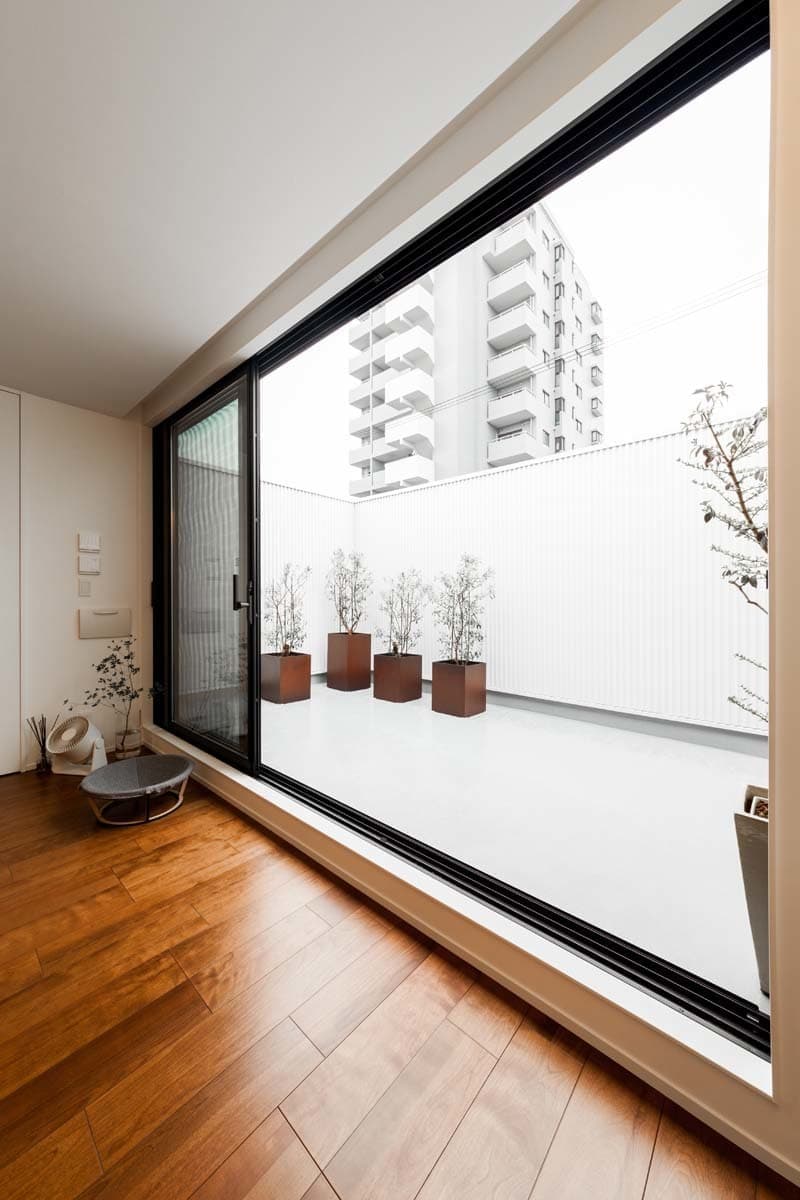 リビングの掃き出し窓を開けるとバルコニーと一体感のある繋がりとなります。