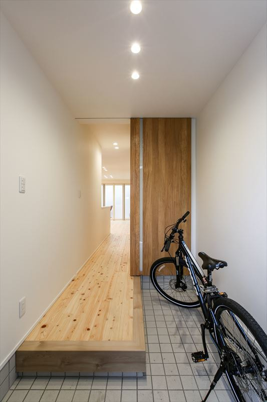 玄関にはご主人のマウンテンバイクが置けるスペースも確保。