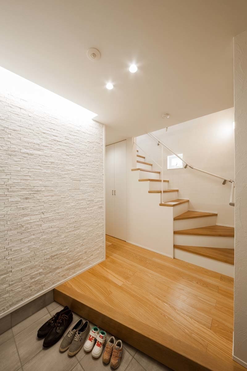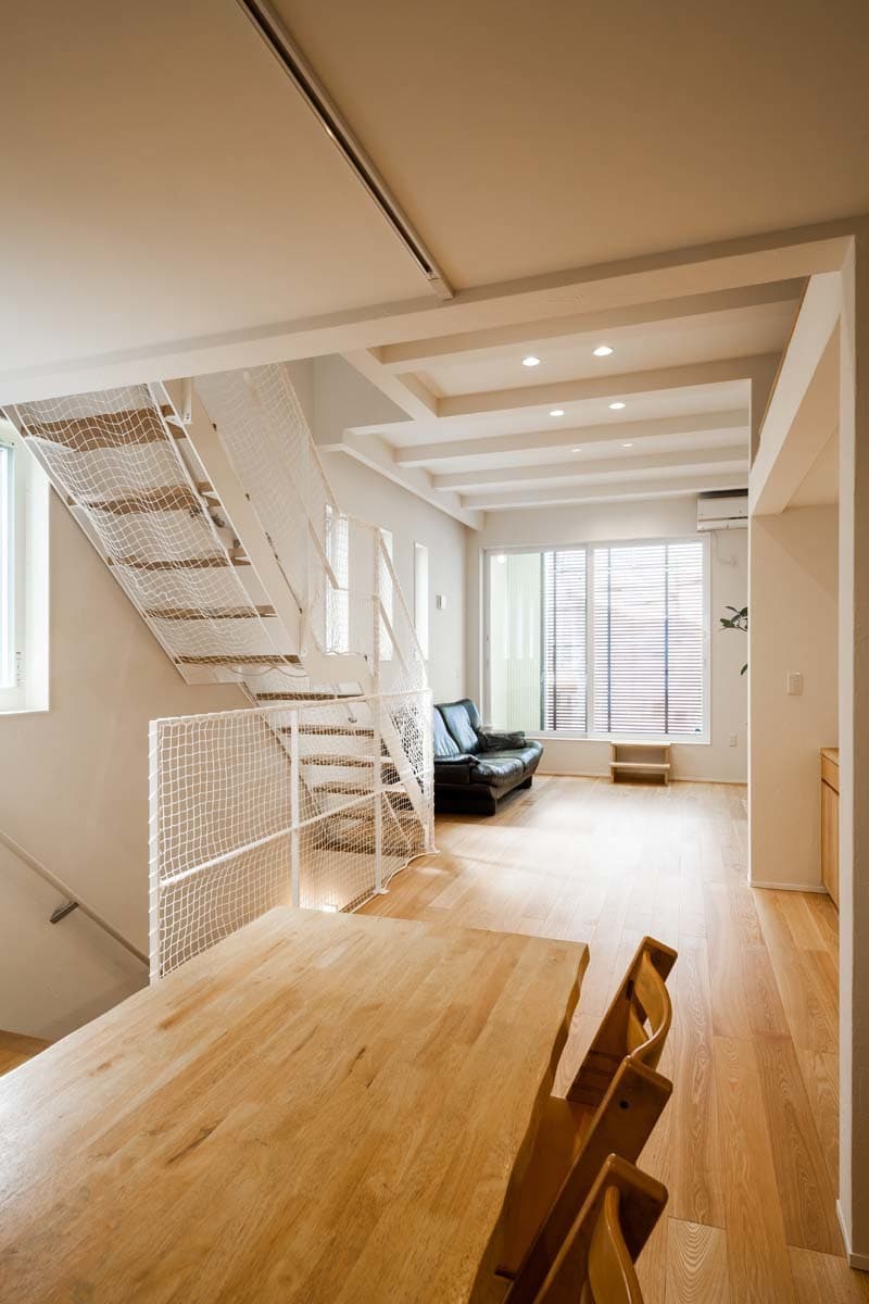 無垢の床と珪藻土のナチュラルなテイスト。スケルトンの鉄骨階段は開放的な空間を演出しています。