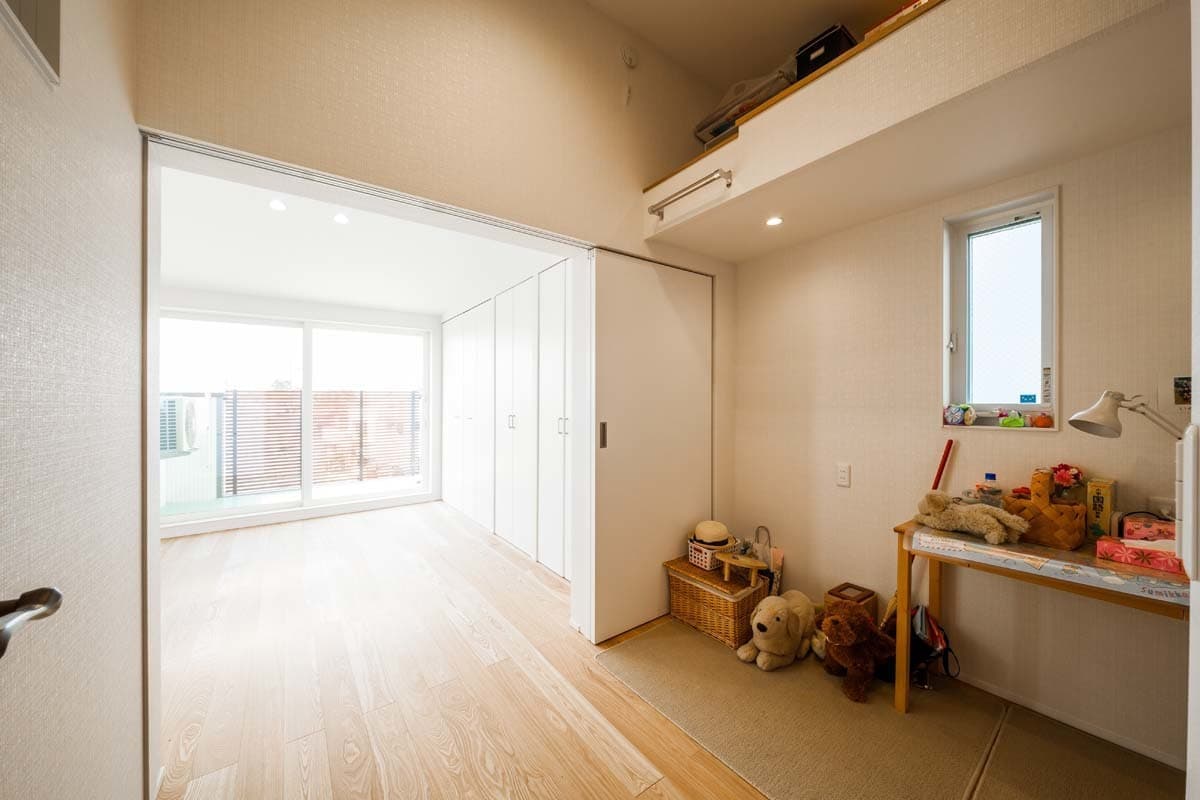3階にはロフトとウォークインクローゼットがある主寝室と、広めの子供部屋があります。壁でなく、建具で仕切れるようなプランニングなので、将来お子様の成長に合わせてフレキシブルに対応できるようになっています。これもSE構法の特徴を生かした提案です。