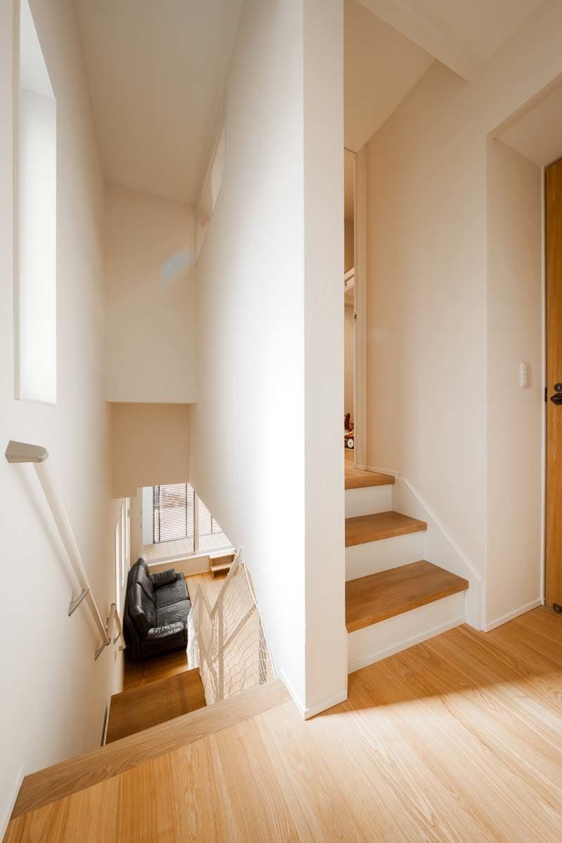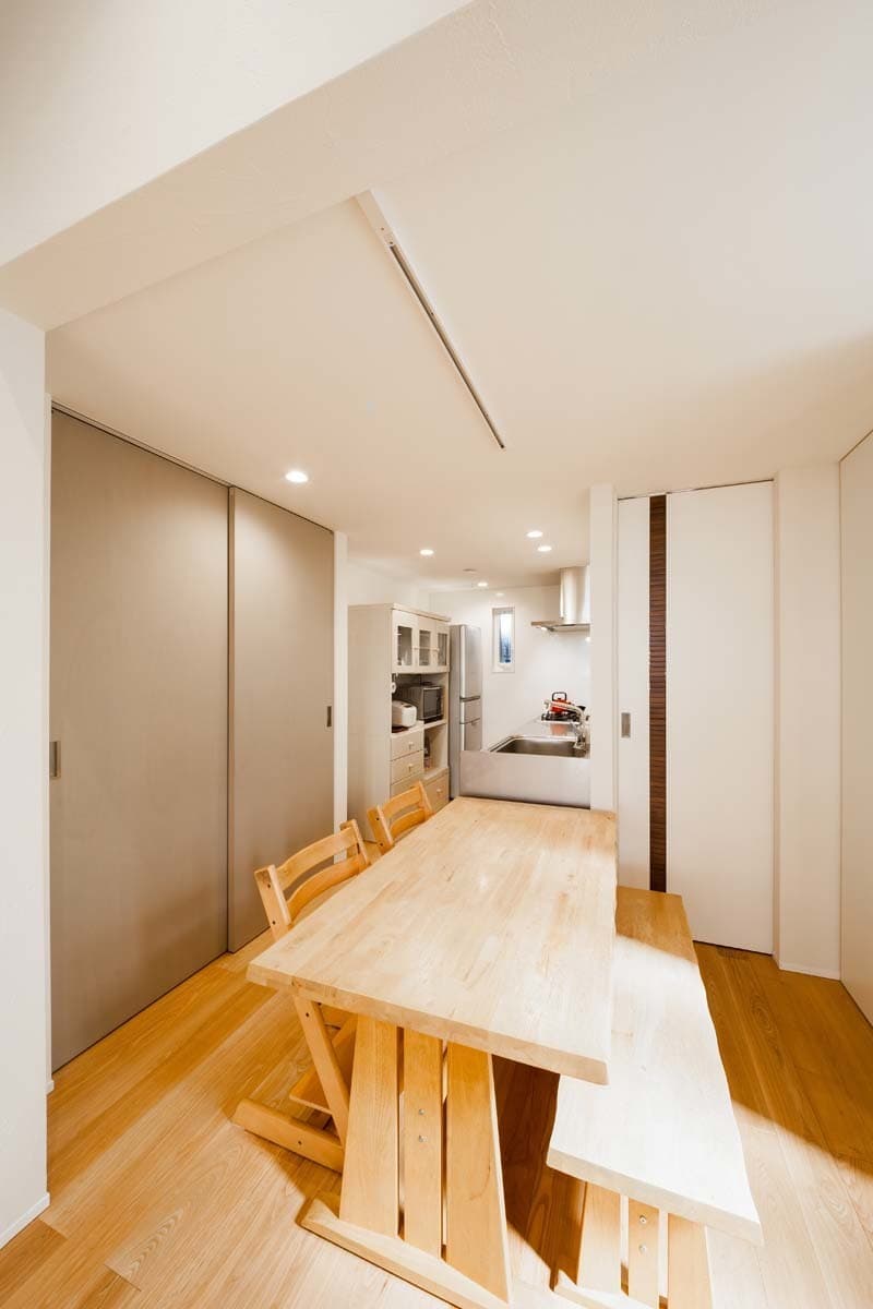 2階のLDKは天井に段差を付けてあり、キッチンの天井に比べるとリビング部分は開放的な高い天井となっています。これは3階部分が一部スキップフロアとして設計することで可能となった気持ち良い空間提案です。珪藻土を塗った優しいテイストの内壁とも相まって、心地よいリビング空間を実現しています。