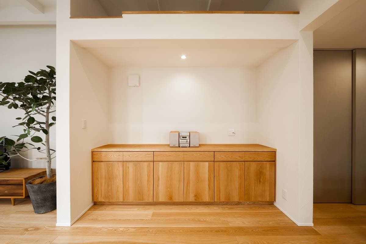 お施主様こだわりの造作家具。床のテイストととても合っていて、とてもいい感じです。