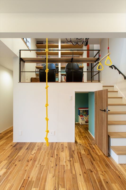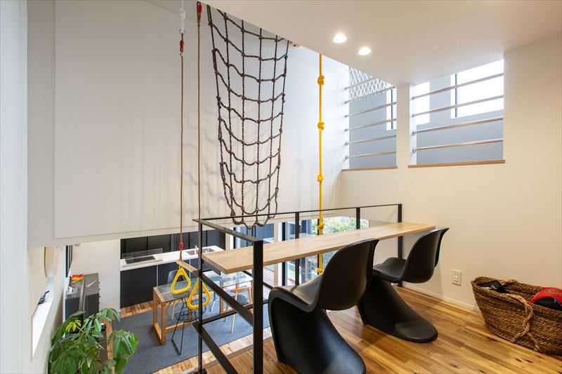 この家の一番の特徴は、リビングから2階に上がる踊り場部分をスキップフロアにしたことです。そこは、子供たちが勉強もできるデスクコーナーにもなっており、つるされたロープで遊び場としても楽しんでいるようです。その下は納戸として活用して、変化のある空間となっています。